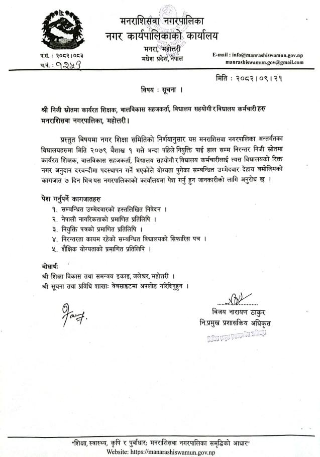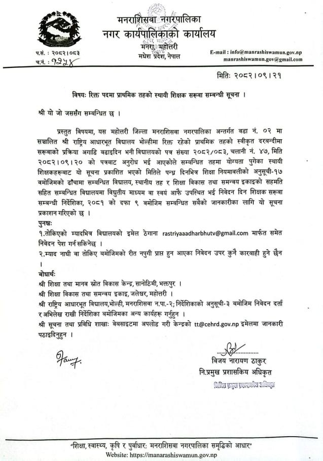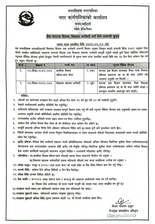 सेवा करारमा शिक्षक, बिद्यालय कर्मचारी भर्ना लिने सम्बन्धी सूचना।